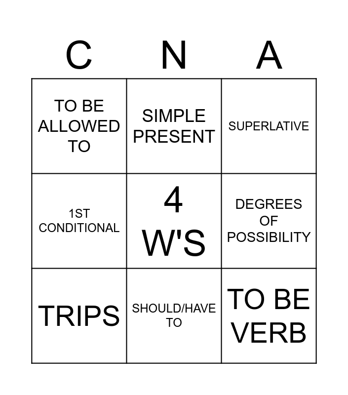 This bingo card has 13 words: Free!, SCHOOL SUBJECTS, TRIPS, SIMPLE PRESENT, 1ST CONDITIONAL, 4 W'S, TO BE VERB, SIMPLE FUTURE, SHOULD/HAVE TO, TO BE ALLOWED TO, DEGREES OF POSSIBILITY, SUPERLATIVE and COLLOCATION.