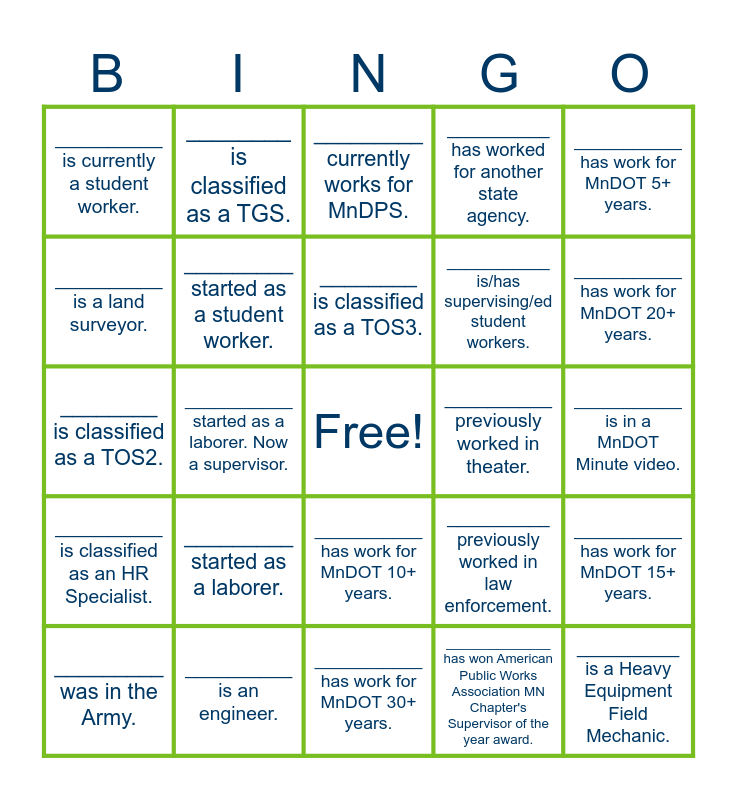 This bingo card has a free space and 24 words: _________ started as a laborer., __________ is an engineer., ________ is classified as a TOS3., _________ was in the Army., ___________ has work for MnDOT 5+ years., __________ is currently a student worker., __________ is a land surveyor., ________ is classified as a TGS., __________ previously worked in theater., ___________ has work for MnDOT 10+ years., ___________ is/has supervising/ed student workers., ________ is classified as a TOS2., __________ previously worked in law enforcement., ___________ has work for MnDOT 15+ years., _________ started as a student worker., ______________ has won American Public Works Association MN Chapter's Supervisor of the year award., ___________ is in a MnDOT Minute video., _________ currently works for MnDPS., ___________ has work for MnDOT 20+ years., ___________ started as a laborer. Now a supervisor., __________ is a Heavy Equipment Field Mechanic., __________ is classified as an HR Specialist., __________ has worked for another state agency. and ___________ has work for MnDOT 30+ years..