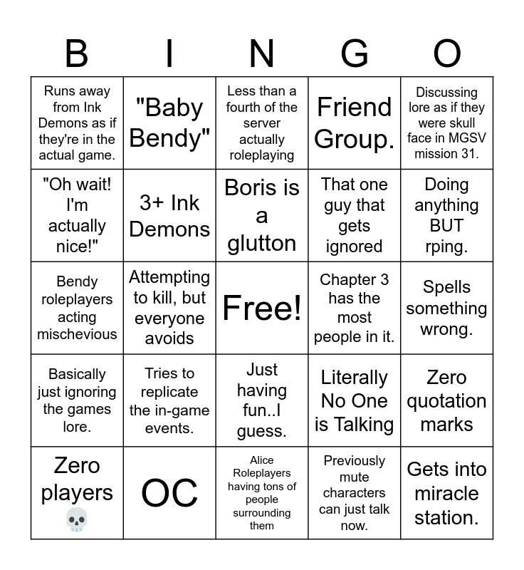 This bingo card has a free space and 24 words: Zero players💀, Tries to replicate the in-game events., Boris is a glutton, Previously mute characters can just talk now., Discussing lore as if they were skull face in MGSV mission 31., Runs away from Ink Demons as if they're in the actual game., "Baby Bendy", Less than a fourth of the server actually roleplaying, Chapter 3 has the most people in it., Spells something wrong., Bendy roleplayers acting mischevious, 3+ Ink Demons, Literally No One is Talking, Zero quotation marks, "Oh wait! I'm actually nice!", OC, Alice Roleplayers having tons of people surrounding them, Friend Group., Doing anything BUT rping., Basically just ignoring the games lore., Attempting to kill, but everyone avoids, Just having fun..I guess., That one guy that gets ignored and Gets into miracle station..