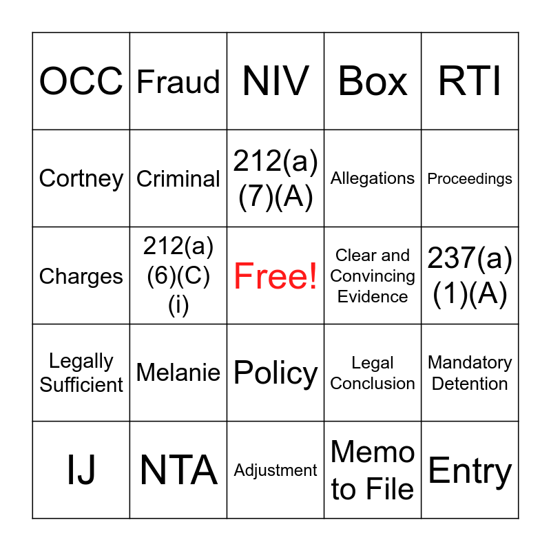 This bingo card has a free space and 24 words: Melanie, NTA, 212(a)(7)(A), IJ, RTI, OCC, Cortney, Fraud, Clear and Convincing Evidence, Policy, Allegations, Charges, Legal Conclusion, Mandatory Detention, Criminal, Memo to File, 237(a)(1)(A), NIV, Proceedings, 212(a)(6)(C)(i), Entry, Legally Sufficient, Box and Adjustment.