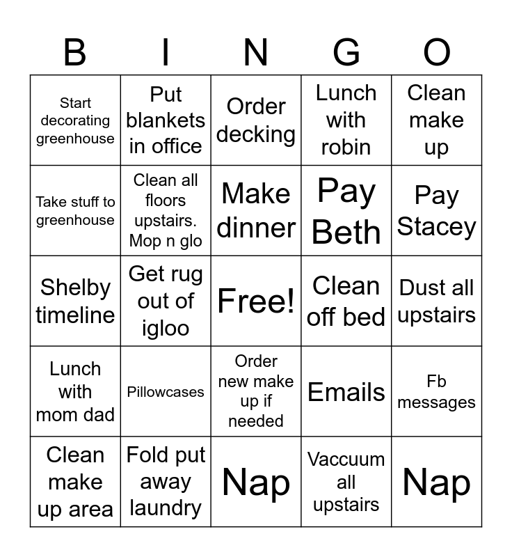 This bingo card has a free space and 24 words: Pillowcases, Fold put away laundry, Make dinner, Clean make up area, Clean make up, Start decorating greenhouse, Take stuff to greenhouse, Put blankets in office, Clean off bed, Order new make up if needed, Pay Beth, Shelby timeline, Emails, Fb messages, Clean all floors upstairs. Mop n glo, Vaccuum all upstairs, Dust all upstairs, Order decking, Pay Stacey, Get rug out of igloo, Nap, Lunch with mom dad, Lunch with robin and Nap.