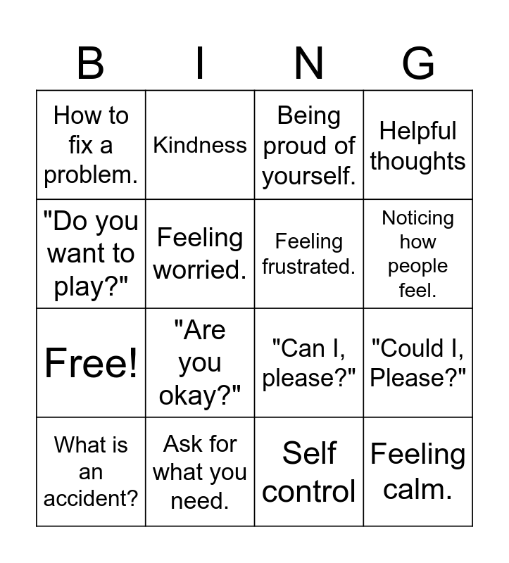 This bingo card has 20 words: "Could I, Please?", "Could we, please?", Being proud of yourself., Pepito!!, What is an accident?, "Do you want to play?", Ask for what you need., How to fix a problem., Free!, Kindness, "Are you okay?", "Can I, please?", Feeling worried., Feeling calm., Feeling frustrated., Kind acts., Noticing how people feel., Helpful thoughts, Self control and How to pay attention..