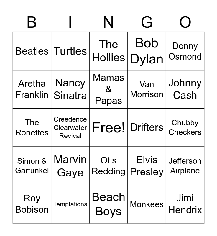 This bingo card has a free space and 24 words: Roy Bobison, Marvin Gaye, Mamas & Papas, Monkees, Donny Osmond, Beatles, Turtles, The Hollies, Drifters, Chubby Checkers, The Ronettes, Nancy Sinatra, Elvis Presley, Jefferson Airplane, Aretha Franklin, Temptations, Beach Boys, Bob Dylan, Johnny Cash, Simon & Garfunkel, Creedence Clearwater Revival, Otis Redding, Van Morrison and Jimi Hendrix.