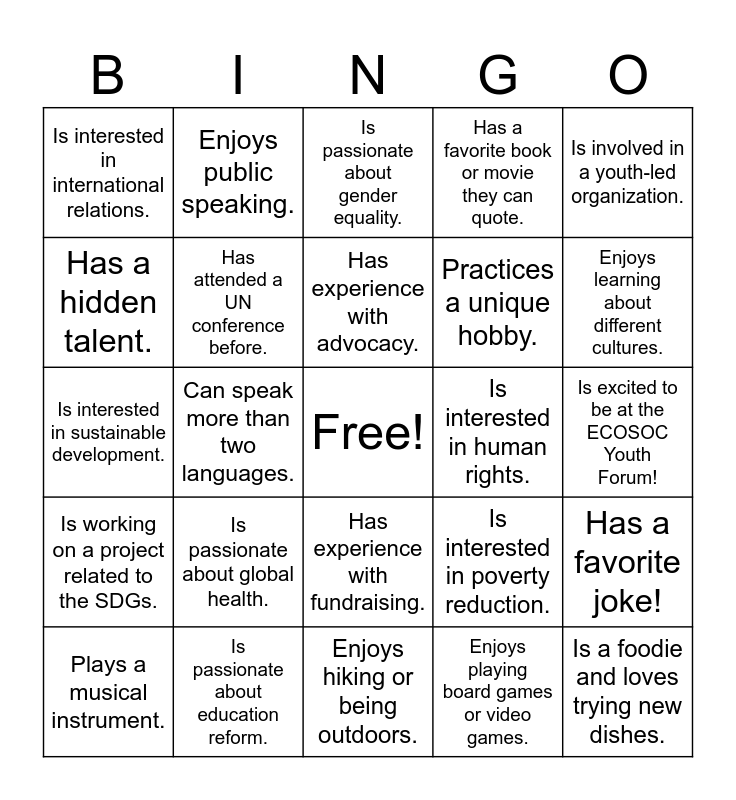 This bingo card has a free space and 33 words: Has traveled to more than 3 countries., Is passionate about climate action., Can speak more than two languages., Volunteers regularly in their community., Is working on a project related to the SDGs., Has attended a UN conference before., Is involved in a youth-led organization., Plays a musical instrument., Enjoys public speaking., Is interested in global policy., Has experience with advocacy., Is passionate about gender equality., Knows how to code., Has created their own startup or social enterprise., Is interested in human rights., Enjoys learning about different cultures., Is passionate about education reform., Is interested in sustainable development., Is passionate about global health., Is interested in poverty reduction., Has experience with fundraising., Is passionate about innovation., Is interested in international relations., Is excited to be at the ECOSOC Youth Forum!, Enjoys hiking or being outdoors., Is a foodie and loves trying new dishes., Has a favorite book or movie they can quote., Practices a unique hobby., Has a hidden talent., Has a favorite joke!, Is a coffee or tea enthusiast., Enjoys playing board games or video games. and Has a pet they adore..