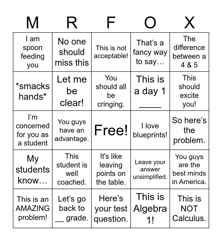 This bingo card has a free space and 24 words: This student is well coached., Let’s go back to __ grade., You should all be cringing., This is an AMAZING problem!, The difference between a 4 & 5, I am spoon feeding you, *smacks hands*, No one should miss this, I love blueprints!, It's like leaving points on the table., This is a day 1 ____, I’m concerned for you as a student, Leave your answer unsimplified., You guys are the best minds in America., Let me be clear!, This is Algebra 1!, So here’s the problem., This is not acceptable!, This should excite you!, You guys have an advantage., This is NOT Calculus., My students know…, That’s a fancy way to say… and Here’s your test question..