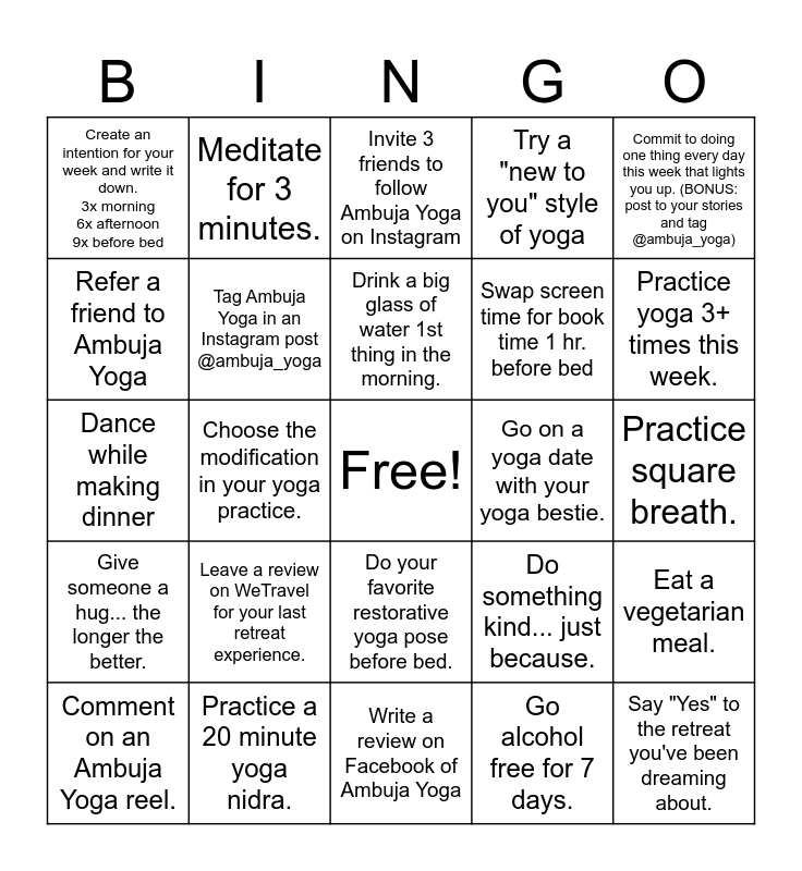 This bingo card has a free space and 24 words: Leave a review on WeTravel for your last retreat experience., Practice a 20 minute yoga nidra., Drink a big glass of water 1st thing in the morning., Comment on an Ambuja Yoga reel., Commit to doing one thing every day this week that lights you up. (BONUS: post to your stories and tag @ambuja_yoga), Create an intention for your week and write it down. 3x morning 6x afternoon 9x before bed, Refer a friend to Ambuja Yoga, Meditate for 3 minutes., Go on a yoga date with your yoga bestie., Do your favorite restorative yoga pose before bed., Swap screen time for book time 1 hr. before bed, Dance while making dinner, Do something kind... just because., Eat a vegetarian meal., Tag Ambuja Yoga in an Instagram post @ambuja_yoga, Go alcohol free for 7 days., Practice square breath., Invite 3 friends to follow Ambuja Yoga on Instagram, Practice yoga 3+ times this week., Choose the modification in your yoga practice., Say "Yes" to the retreat you've been dreaming about., Give someone a hug... the longer the better., Try a "new to you" style of yoga and Write a review on Facebook of Ambuja Yoga.