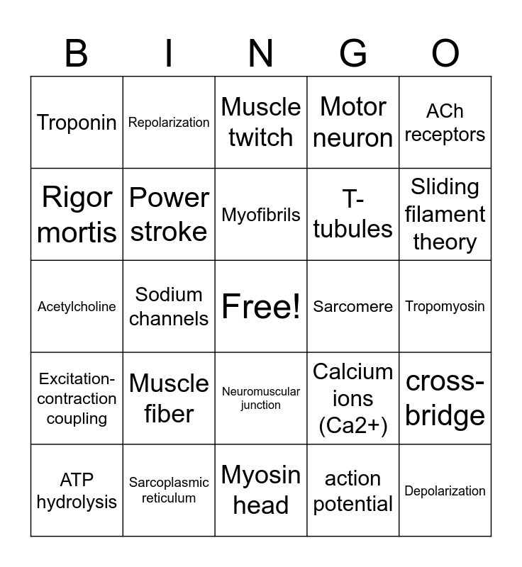 This bingo card has a free space and 24 words: Muscle fiber, Sarcoplasmic reticulum, Myofibrils, ATP hydrolysis, ACh receptors, Troponin, Rigor mortis, Repolarization, Sarcomere, Neuromuscular junction, T-tubules, Acetylcholine, Calcium ions (Ca2+), cross-bridge, Power stroke, action potential, Tropomyosin, Muscle twitch, Sliding filament theory, Sodium channels, Depolarization, Excitation-contraction coupling, Motor neuron and Myosin head.