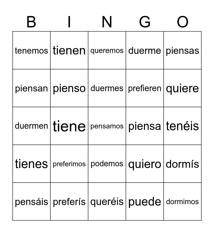 This bingo card has 36 words: tengo, duermo, prefiero, pienso, quiero, tienes, duermes, prefieres, piensas, quieres, tiene, duerme, prefiere, piensa, quiere, tenemos, dormimos, preferimos, pensamos, queremos, tenéis, dormís, preferís, pensáis, queréis, tienen, duermen, juegan, prefieren, piensan, puedo, puedes, puede, podemos, podéis and pueden.