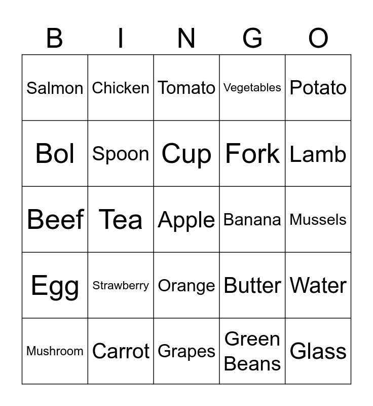 This bingo card has 43 words: Free!, Apple, Fruit, Mushroom, Spinach, Green Beans, Tomato, Onion, Potato, Carrot, Vegetables, Banana, Orange, Strawberry, Cherry, Grapes, Meat, Beef, Pork, Lamb, Chicken, Duck, Fish, Salmon, Trout, Mussels, Milk, Cheese, Butter, Egg, Drinks, Water, Coffee, Tea, Juice, Plate, Glass, Cup, Bol, Fork, Knife, Spoon and Napkin.