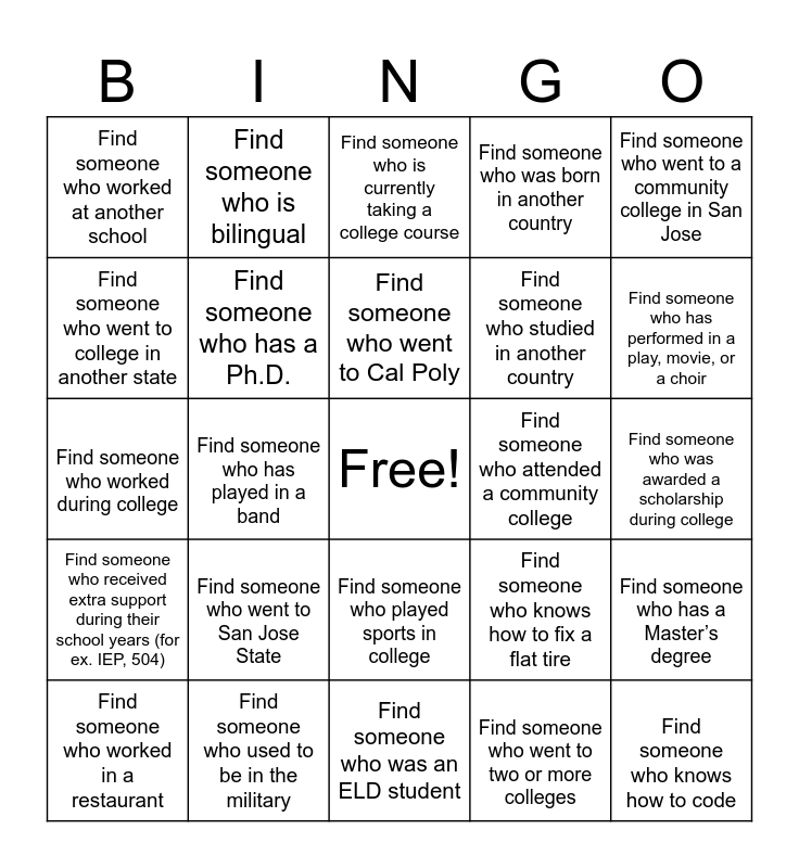 This bingo card has a free space and 24 words: Find someone who went to San Jose State, Find someone who used to be in the military, Find someone who went to Cal Poly, Find someone who worked in a restaurant, Find someone who went to a community college in San Jose, Find someone who worked at another school, Find someone who went to college in another state, Find someone who is bilingual, Find someone who attended a community college, Find someone who played sports in college, Find someone who studied in another country, Find someone who worked during college, Find someone who knows how to fix a flat tire, Find someone who has a Master’s degree, Find someone who has a Ph.D., Find someone who went to two or more colleges, Find someone who was awarded a scholarship during college, Find someone who is currently taking a college course, Find someone who has performed in a play, movie, or a choir, Find someone who has played in a band, Find someone who knows how to code, Find someone who received extra support during their school years (for ex. IEP, 504), Find someone who was born in another country and Find someone who was an ELD student.