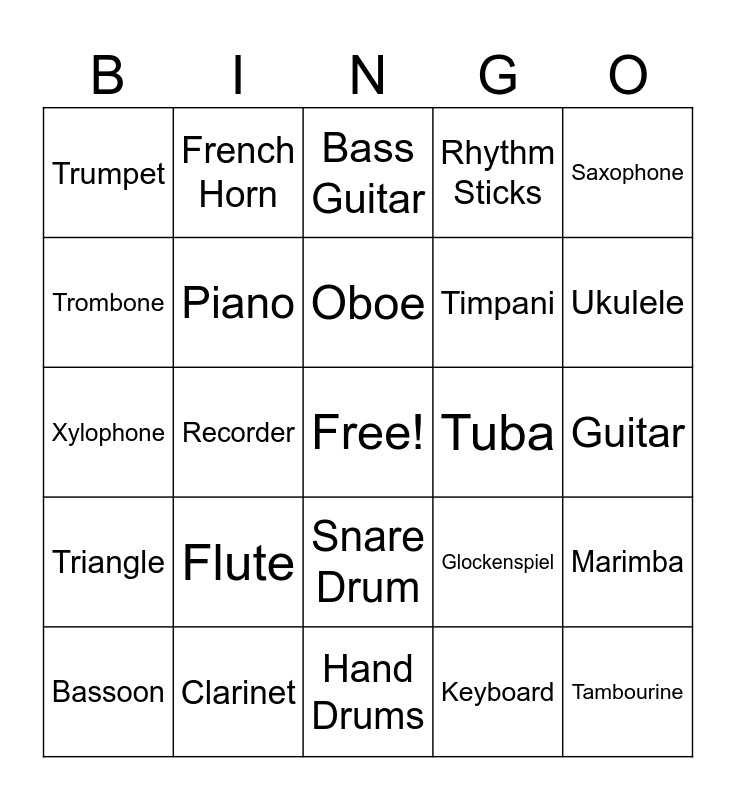 This bingo card has a free space and 24 words: Flute, Clarinet, Oboe, Bassoon, Saxophone, Trumpet, Trombone, French Horn, Tuba, Snare Drum, Timpani, Xylophone, Glockenspiel, Marimba, Piano, Keyboard, Guitar, Bass Guitar, Ukulele, Recorder, Tambourine, Triangle, Rhythm Sticks and Hand Drums.