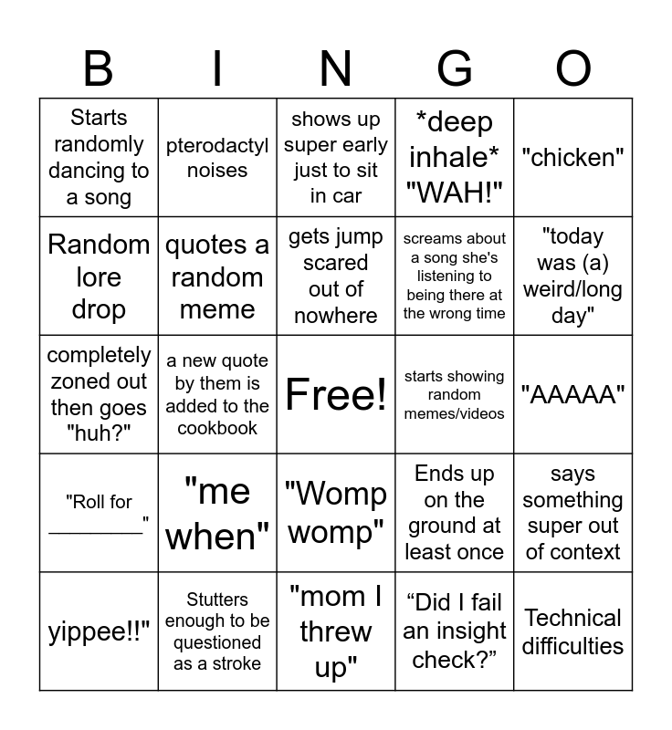 This bingo card has a free space and 24 words: "me when", Stutters enough to be questioned as a stroke, gets jump scared out of nowhere, yippee!!", "chicken", Starts randomly dancing to a song, Random lore drop, pterodactyl noises, starts showing random memes/videos, "Womp womp", screams about a song she's listening to being there at the wrong time, completely zoned out then goes "huh?", Ends up on the ground at least once, says something super out of context, quotes a random meme, “Did I fail an insight check?”, "AAAAA", shows up super early just to sit in car, "today was (a) weird/long day", a new quote by them is added to the cookbook, Technical difficulties, "Roll for _________", *deep inhale* "WAH!" and "mom I threw up".