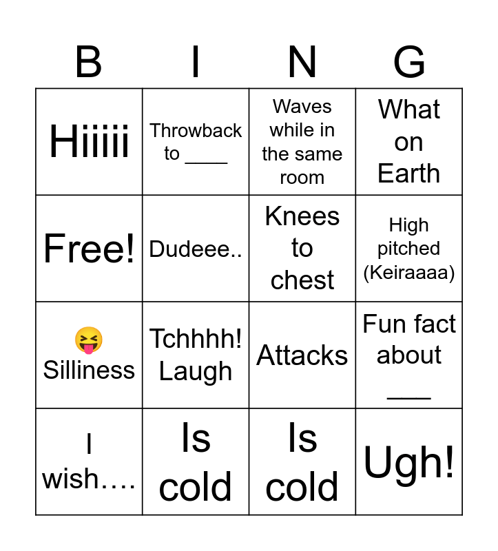 This bingo card has 16 words: Is cold, Fun fact about ___, Waves while in the same room, Hiiiii, 😝 Silliness, Throwback to ____, Attacks, Is cold, Free!, Dudeee.., I wish…., What on Earth, Tchhhh! Laugh, High pitched (Keiraaaa), Knees to chest and Ugh!.