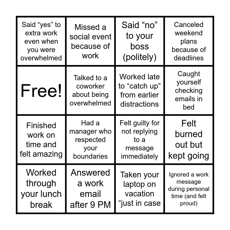 This bingo card has 16 words: Answered a work email after 9 PM, Felt burned out but kept going, Said “no” to your boss (politely), Said “yes” to extra work even when you were overwhelmed, Finished work on time and felt amazing, Missed a social event because of work, Felt guilty for not replying to a message immediately, Taken your laptop on vacation “just in case, Free!, Talked to a coworker about being overwhelmed, Worked through your lunch break, Canceled weekend plans because of deadlines, Had a manager who respected your boundaries, Caught yourself checking emails in bed, Worked late to “catch up” from earlier distractions and Ignored a work message during personal time (and felt proud).
