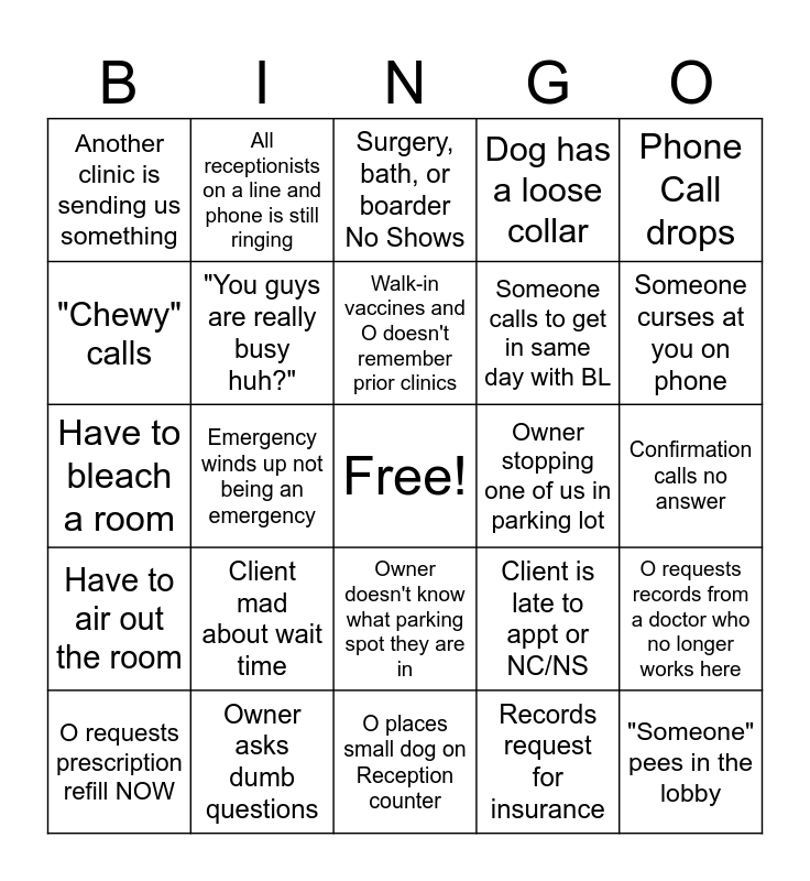 This bingo card has a free space and 24 words: Client mad about wait time, Owner asks dumb questions, Walk-in vaccines and O doesn't remember prior clinics, O requests prescription refill NOW, Phone Call drops, Another clinic is sending us something, "Chewy" calls, All receptionists on a line and phone is still ringing, Owner stopping one of us in parking lot, Owner doesn't know what parking spot they are in, Someone calls to get in same day with BL, Have to bleach a room, Client is late to appt or NC/NS, O requests records from a doctor who no longer works here, "You guys are really busy huh?", Records request for insurance, Confirmation calls no answer, Surgery, bath, or boarder No Shows, Someone curses at you on phone, Emergency winds up not being an emergency, "Someone" pees in the lobby, Have to air out the room, Dog has a loose collar and O places small dog on Reception counter.