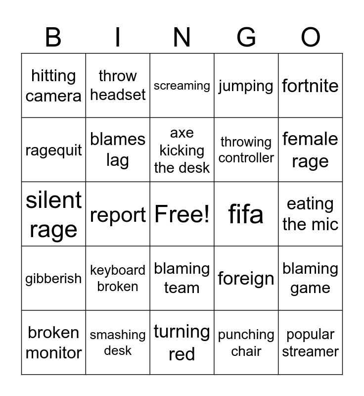 This bingo card has a free space and 24 words: keyboard broken, smashing desk, axe kicking the desk, broken monitor, fortnite, hitting camera, ragequit, throw headset, fifa, blaming team, throwing controller, silent rage, foreign, blaming game, blames lag, punching chair, eating the mic, screaming, female rage, report, popular streamer, gibberish, jumping and turning red.