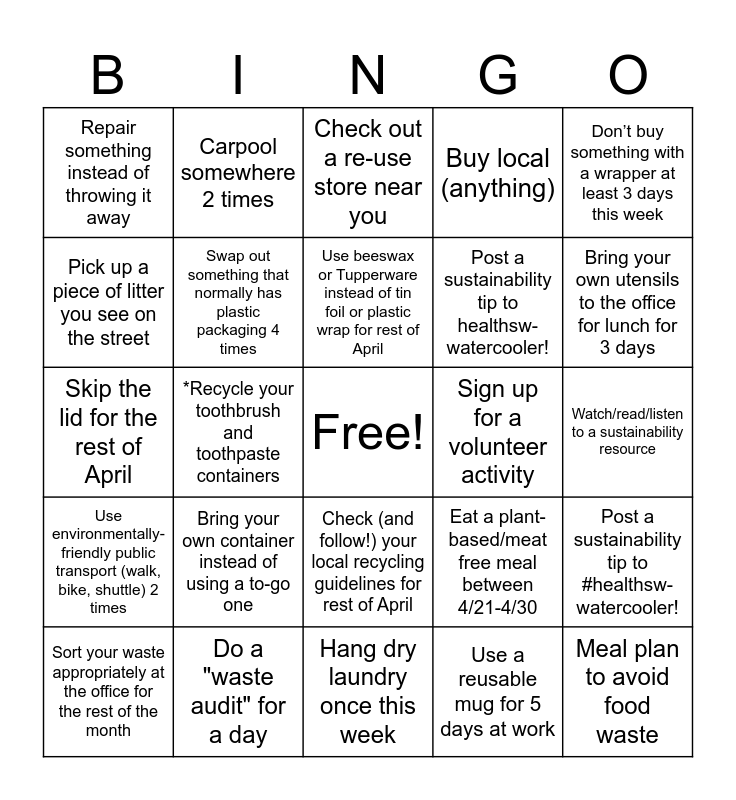 This bingo card has a free space and 34 words: Use a reusable water bottle for 7 days straight, Use a reusable mug for 5 days at work, Bring a reusable grocery bag to at least 3 store visits, Choose “For Here” at Caffé Macs or bring lunch this week, Use environmentally-friendly public transport (walk, bike, shuttle) 2 times, Swap out something that normally has plastic packaging 4 times, Don’t buy something with a wrapper at least 3 days this week, Sort your waste appropriately at the office for the rest of the month, Carpool somewhere 2 times, Use rags or towels instead of paper towels/napkins at least 2 days this week, Use beeswax or Tupperware instead of tin foil or plastic wrap for rest of April, Check out a re-use store near you, Wear an article of clothing you haven’t worn in a while (or donate it)!, Borrow something instead of buying it, Sign up for a volunteer activity, Bring your own utensils to the office for lunch for 3 days, Do a "waste audit" for a day, Skip the lid for the rest of April, Bring your own container instead of using a to-go one, Eat a plant-based/meat free meal between 4/21-4/30, Check (and follow!) your local recycling guidelines for rest of April, Unplug electronics you don't use often, Repair something instead of throwing it away, Watch/read/listen to a sustainability resource, Hang dry laundry once this week, Meal plan to avoid food waste, Buy local (anything), Program your thermostat to save energy for the rest of the month, Post a sustainability tip to healthsw-watercooler!, Pick up a piece of litter you see on the street, Don’t purchase anything except necessary items this week, *Recycle your toothbrush and toothpaste containers, Post a sustainability tip to #healthsw-watercooler! and Bring something for the clothing swap on 4/29.