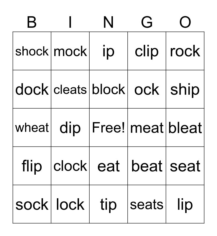 This bingo card has a free space and 24 words: clock, lock, block, sock, rock, shock, dock, mock, meat, eat, ock, wheat, beat, seat, cleats, seats, bleat, ip, ship, dip, lip, flip, clip and tip.