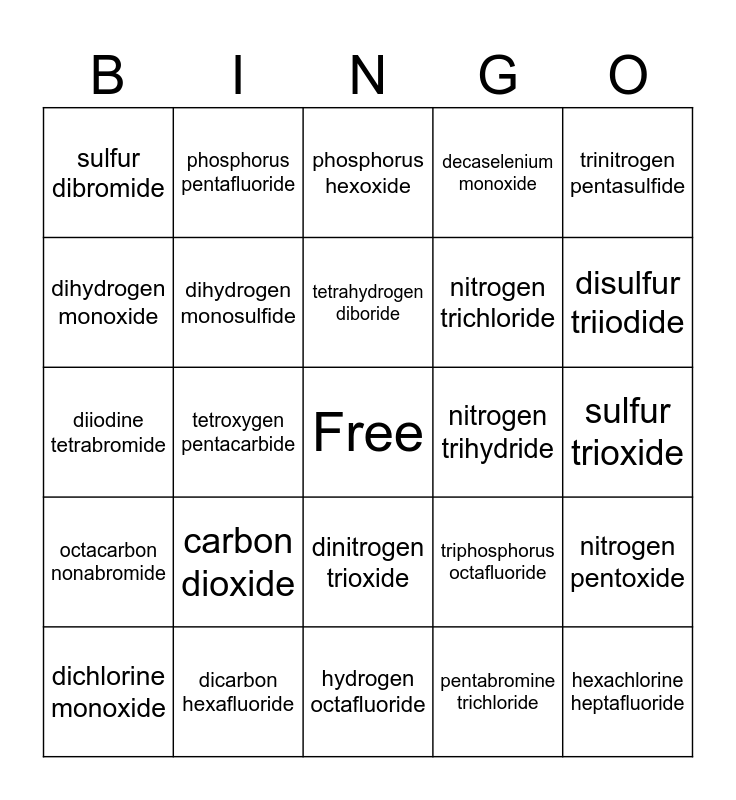 This bingo card has a free space and 24 words: carbon dioxide, dicarbon hexafluoride, tetrahydrogen diboride, dichlorine monoxide, trinitrogen pentasulfide, sulfur dibromide, dihydrogen monoxide, phosphorus pentafluoride, nitrogen trihydride, dinitrogen trioxide, nitrogen trichloride, diiodine tetrabromide, triphosphorus octafluoride, nitrogen pentoxide, dihydrogen monosulfide, pentabromine trichloride, sulfur trioxide, phosphorus hexoxide, disulfur triiodide, tetroxygen pentacarbide, hexachlorine heptafluoride, octacarbon nonabromide, decaselenium monoxide and hydrogen octafluoride.