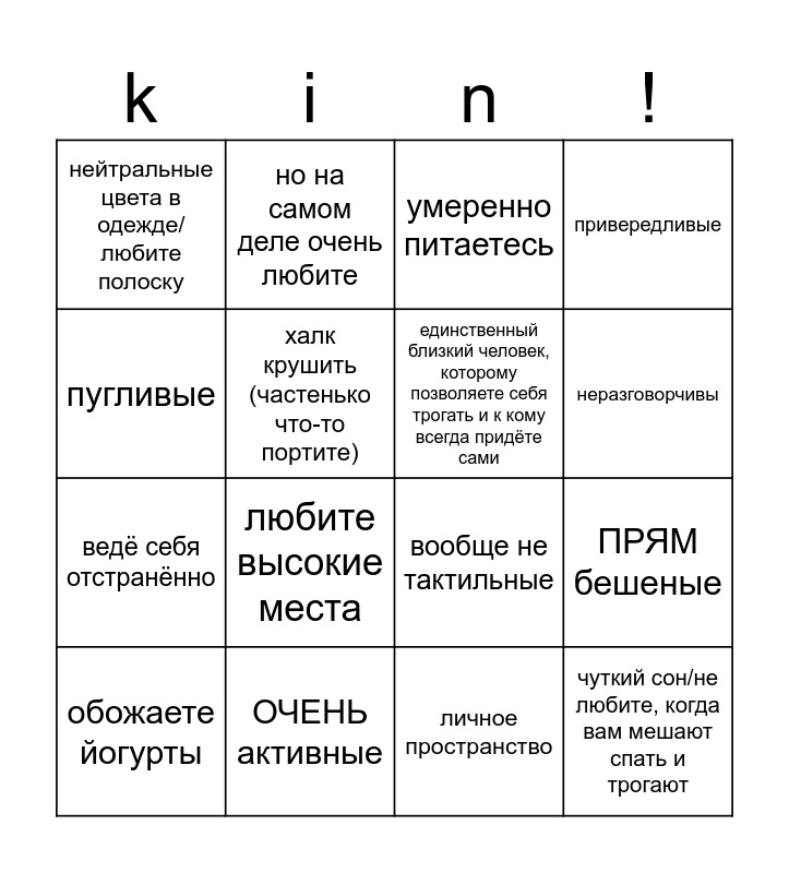 This bingo card has 16 words: ОЧЕНЬ активные, ПРЯМ бешеные, умеренно питаетесь, нейтральные цвета в одежде/любите полоску, ведё себя отстранённо, но на самом деле очень любите, вообще не тактильные, личное пространство, пугливые, халк крушить (частенько что-то портите), обожаете йогурты, привередливые, любите высокие места, неразговорчивы, единственный близкий человек, которому позволяете себя трогать и к кому всегда придёте сами and чуткий сон/не любите, когда вам мешают спать и трогают.