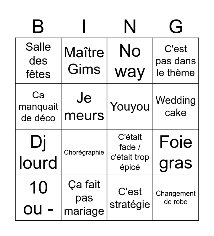 This bingo card has 16 words: Ça fait pas mariage, Foie gras, No way, Salle des fêtes, Dj lourd, Maître Gims, C'était fade / c'était trop épicé, C'est stratégie, Ca manquait de déco, Je meurs, 10 ou -, C'est pas dans le thème, Chorégraphie, Wedding cake, Youyou and Changement de robe.
