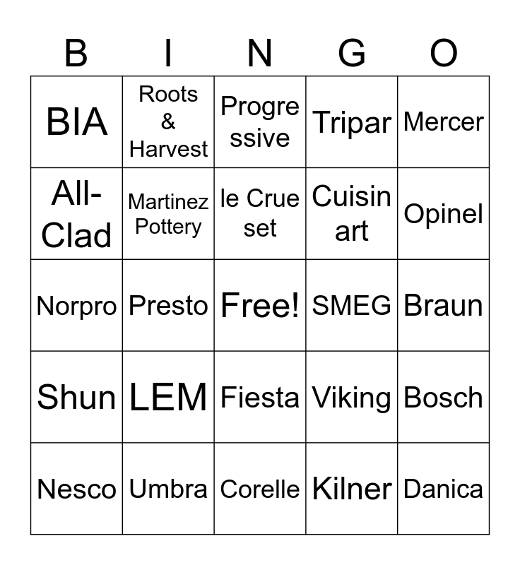 This bingo card has a free space and 24 words: LEM, Umbra, le Crue set, Nesco, Mercer, BIA, All- Clad, Roots & Harvest, SMEG, Fiesta, Cuisin art, Norpro, Viking, Bosch, Martinez Pottery, Kilner, Braun, Progre ssive, Opinel, Presto, Danica, Shun, Tripar and Corelle.