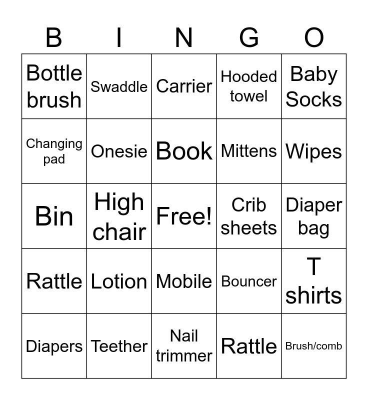 This bingo card has a free space and 33 words: Bassinet, Tub, High chair, Bottle, Rattle, Onesie, Baby Socks, Diapers, Swaddle, Baby shoes, Book, Carrier, Baby monitor, Teddy bear, Crib sheets, Wipes, Teether, Bin, Lotion, Bouncer, Mobile, Soap, Bottle brush, Diaper bag, Nail trimmer, Brush/comb, Hooded towel, Mittens, Changing pad, T shirts, Beanie, Rattle and Pacifier.