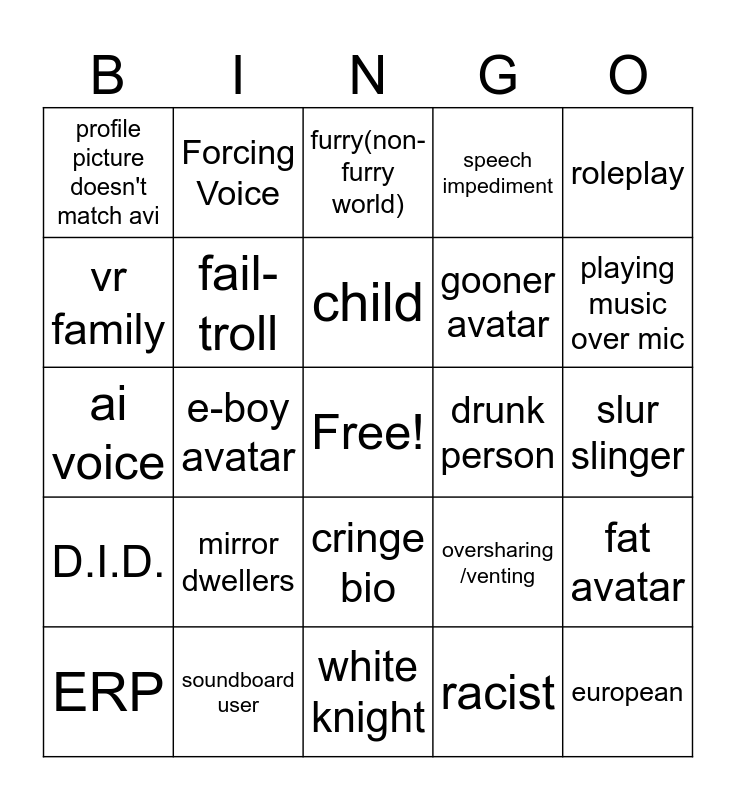 This bingo card has a free space and 34 words: e-daters, racist, grooming, "the voice", D.I.D., fail-troll, roleplay, ERP, Forcing Voice, singing, child, furry(non-furry world), loli avatar, fandom avatar, drunk person, playing music over mic, soundboard user, ai voice, mirror dwellers, oversharing /venting, cringe bio, weird groups, profile picture doesn't match avi, slur slinger, white knight, european, speech impediment, femboy, gooner avatar, vr family, power tripping admin, e-boy avatar, fat avatar and pick-me.