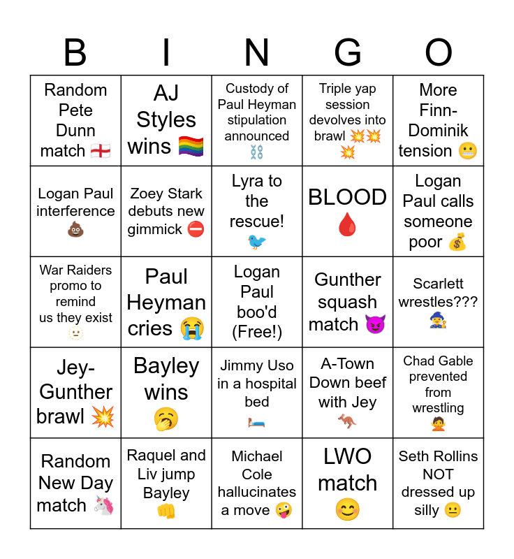 This bingo card has a free space and 24 words: Bayley wins 🥱, Raquel and Liv jump Bayley 👊, Lyra to the rescue! 🐦, Random New Day match 🦄, More Finn-Dominik tension 😬, Random Pete Dunn match 🏴, Logan Paul interference 💩, AJ Styles wins 🏳️🌈, Gunther squash match 😈, Jimmy Uso in a hospital bed 🛏️, BLOOD🩸, War Raiders promo to remind us they exist 🫥, A-Town Down beef with Jey 🦘, Chad Gable prevented from wrestling 🙅, Zoey Stark debuts new gimmick ⛔️, LWO match 😊, Scarlett wrestles??? 🧙♀️, Custody of Paul Heyman stipulation announced ⛓️, Logan Paul calls someone poor 💰, Paul Heyman cries 😭, Seth Rollins NOT dressed up silly 😐, Jey-Gunther brawl 💥, Triple yap session devolves into brawl 💥💥💥 and Michael Cole hallucinates a move 🤪.