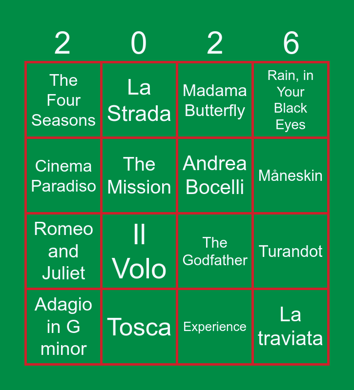 This bingo card has 16 words: Tosca, Turandot, Madama Butterfly, The Four Seasons, Romeo and Juliet, La Strada, The Godfather, Experience, Cinema Paradiso, The Mission, Adagio in G minor, Rain, in Your Black Eyes, Il Volo, Måneskin, Andrea Bocelli and La traviata.