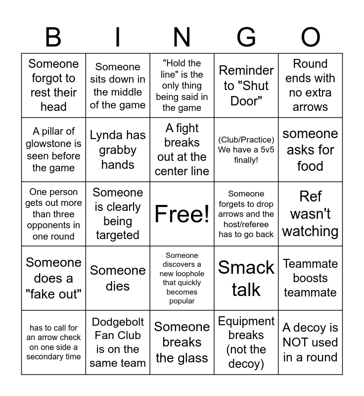 This bingo card has a free space and 46 words: Host Falls off the Beam, A decoy is NOT used in a round, "Ready in 10" is ready in 1, Someone breaks the glass, Someone dies, Someone is hit from the beam, Someone sits down in the middle of the game, Eliminated by Friendly Fire, A pillar of glowstone is seen before the game, Game ends with one side not losing one member, Lynda has grabby hands, Reminder to "Shut Door", Teammate boosts teammate, Smack talk, Arrows are passed out in the middle of gameplay (legally), Final game ends in a 1v1, A fight breaks out at the center line, Someone forgets to drop arrows and the host/referee has to go back, Referee/host threatens a player with an arrest, Round ends with no extra arrows, Someone is clearly being targeted, Equipment breaks (not the decoy), Someone forgot to rest their head, (Club/Practice) We have a 5v5 finally!, Someone is pulled over the line via fishing rod, someone asks for food, has to call for an arrow check on one side a secondary time, someone uses their teammate as a shield, Someone discovers a new loophole that quickly becomes popular, Someone does a "fake out", Baroness is playing (Club), Someone asks for an all v 1 and the 1 wins, Round is over in 5 seconds or less, Petty Shot, WASTE Holding happened (GASP), Dodgebolt Fan Club is on the same team, Ref wasn't watching, Someone is a pin cushion, VERY good dodging, Clarification of the rules is called into question, His Majesty can't lose, "Hold the line" is the only thing being said in the game, One person gets out more than three opponents in one round, Person with all of the arrows is shot, "No Mercy" Ser Akhiilor and Team name that someone refuses to say outload.