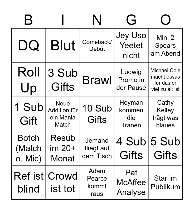 This bingo card has a free space and 24 words: Ref ist blind, Resub im 20+ Monat, Brawl, Pat McAffee Analyse, Min. 2 Spears am Abend, DQ, Blut, Comeback/ Debut, Heyman kommen die Tränen, Cathy Kelley trägt was blaues, 1 Sub Gift, 3 Sub Gifts, 4 Sub Gifts, 5 Sub Gifts, Roll Up, Crowd ist tot, Adam Pearce kommt raus, Jey Uso Yeetet nicht, Michael Cole macht etwas für das er viel zu alt ist, Botch (Match o. Mic), Neue Addition für ein Mania Match, Jemand fliegt auf dem Tisch, Ludwig Promo in der Pause and Star im Publikum.