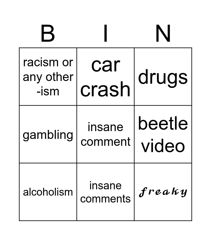 This bingo card has a free space and 9 words: alcoholism, drugs, car crash, gambling, racism or any other -ism, beetle video, 𝓯𝓻𝓮𝓪𝓴𝔂, dead meme and insane comments.