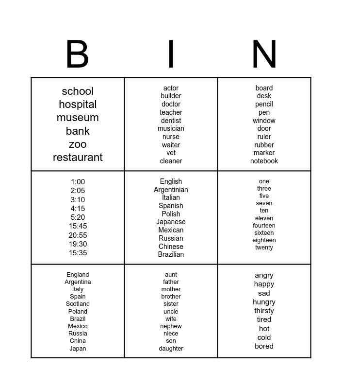 This bingo card has 9 words: England Argentina Italy Spain Scotland Poland Brazil Mexico Russia China Japan, English Argentinian Italian Spanish Polish Japanese Mexican Russian Chinese Brazilian, board desk pencil pen window door ruler rubber marker notebook, school hospital museum bank zoo restaurant, actor builder doctor teacher dentist musician nurse waiter vet cleaner, one three five seven ten eleven fourteen sixteen eighteen twenty, 1:00 2:05 3:10 4:15 5:20 15:45 20:55 19:30 15:35, aunt father mother brother sister uncle wife nephew niece son daughter and angry happy sad hungry thirsty tired hot cold bored.