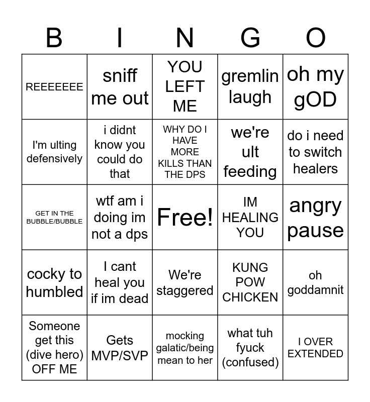 This bingo card has a free space and 24 words: I cant heal you if im dead, Gets MVP/SVP, WHY DO I HAVE MORE KILLS THAN THE DPS, Someone get this (dive hero) OFF ME, oh my gOD, REEEEEEE, I'm ulting defensively, sniff me out, IM HEALING YOU, We're staggered, we're ult feeding, GET IN THE BUBBLE/BUBBLE, KUNG POW CHICKEN, oh goddamnit, i didnt know you could do that, what tuh fyuck (confused), angry pause, YOU LEFT ME, do i need to switch healers, wtf am i doing im not a dps, I OVER EXTENDED, cocky to humbled, gremlin laugh and mocking galatic/being mean to her.