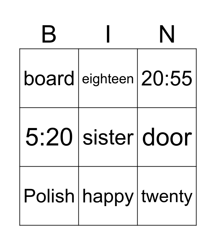 This bingo card has 86 words: England, Argentina, Italy, Spain, Scotland, Poland, Brazil, Mexico, Russia, China, Japan, English, Argentinian, Italian, Spanish, Polish, Japanese, Mexican, Russian, Chinese, Brazilian, angry, happy, sad, hungry, thirsty, tired, hot, cold, bored, aunt, father, mother, brother, sister, uncle, wife, nephew, niece, son, daughter, 1:00, 2:05, 3:10, 4:15, 5:20, 15:45, 20:55, 19:30, 15:35, one, three, five, seven, ten, eleven, fourteen, sixteen, eighteen, twenty, board, desk, pencil, pen, window, door, ruler, rubber, marker, notebook, actor, builder, doctor, teacher, dentist, musician, nurse, waiter, vet, cleaner, school, hospital, museum, bank, zoo and restaurant.