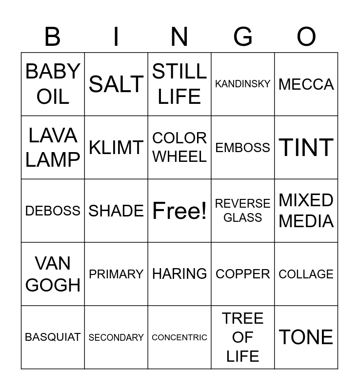 This bingo card has a free space and 24 words: PRIMARY, SECONDARY, COLOR WHEEL, BASQUIAT, MECCA, BABY OIL, LAVA LAMP, SALT, REVERSE GLASS, HARING, EMBOSS, DEBOSS, COPPER, COLLAGE, KLIMT, TREE OF LIFE, MIXED MEDIA, STILL LIFE, TINT, SHADE, TONE, VAN GOGH, KANDINSKY and CONCENTRIC.