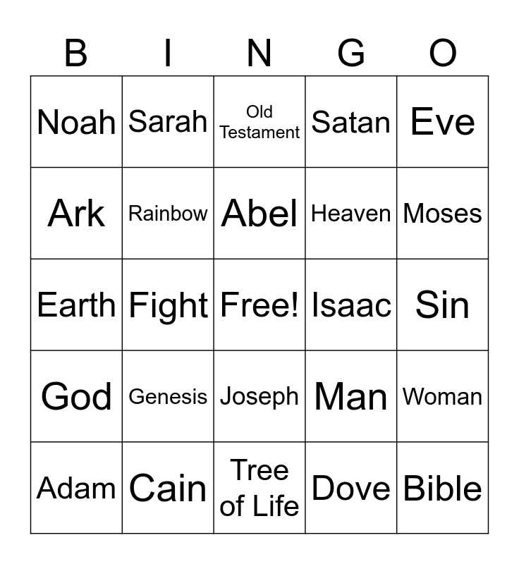 This bingo card has a free space and 24 words: Genesis, Cain, Abel, Adam, Eve, Noah, Ark, Sarah, Isaac, Joseph, Heaven, Earth, Man, Woman, Rainbow, Dove, Sin, Old Testament, Moses, Fight, Bible, God, Satan and Tree of Life.