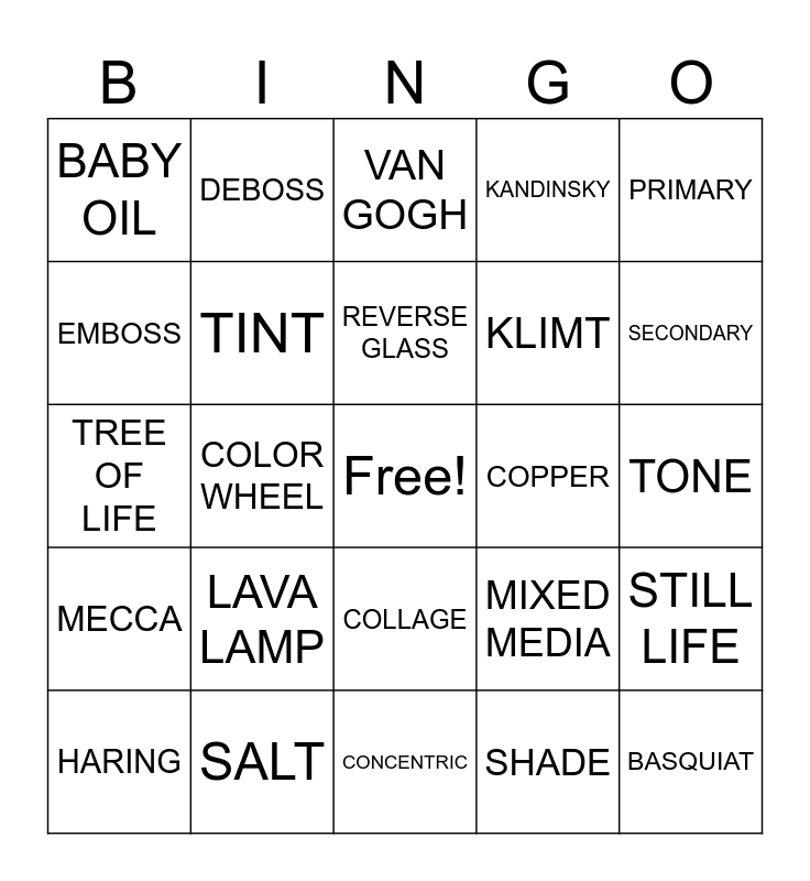 This bingo card has a free space and 24 words: LAVA LAMP, SALT, REVERSE GLASS, HARING, PRIMARY, BABY OIL, EMBOSS, DEBOSS, COPPER, COLLAGE, KLIMT, TREE OF LIFE, MIXED MEDIA, STILL LIFE, TINT, SHADE, TONE, VAN GOGH, SECONDARY, COLOR WHEEL, BASQUIAT, MECCA, KANDINSKY and CONCENTRIC.