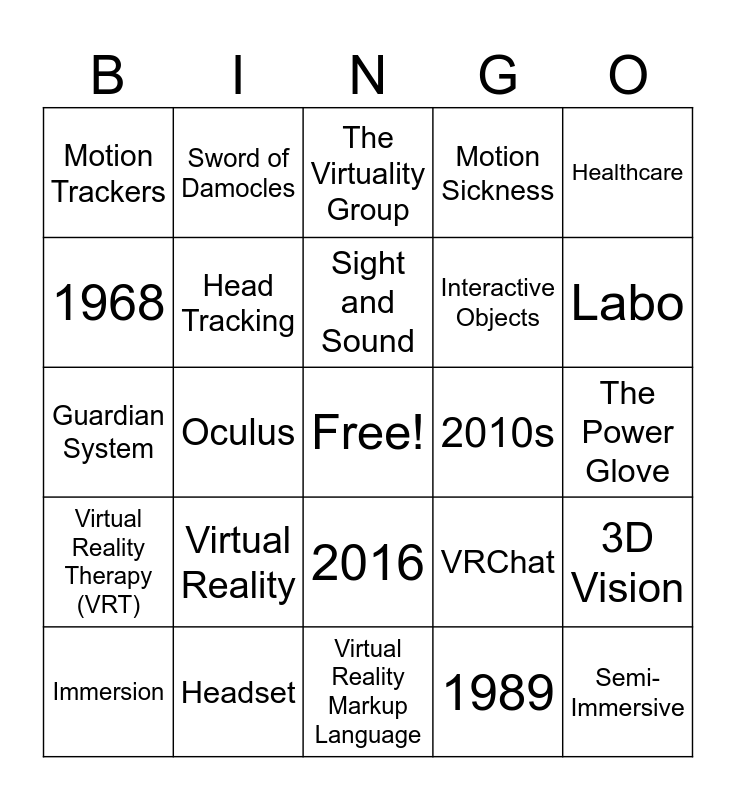 This bingo card has a free space and 24 words: Virtual Reality, Headset, Sight and Sound, Immersion, Healthcare, Motion Trackers, 1968, Sword of Damocles, 2010s, 2016, Interactive Objects, Guardian System, VRChat, 3D Vision, Head Tracking, 1989, The Power Glove, The Virtuality Group, Labo, Oculus, Semi-Immersive, Virtual Reality Therapy (VRT), Motion Sickness and Virtual Reality Markup Language.