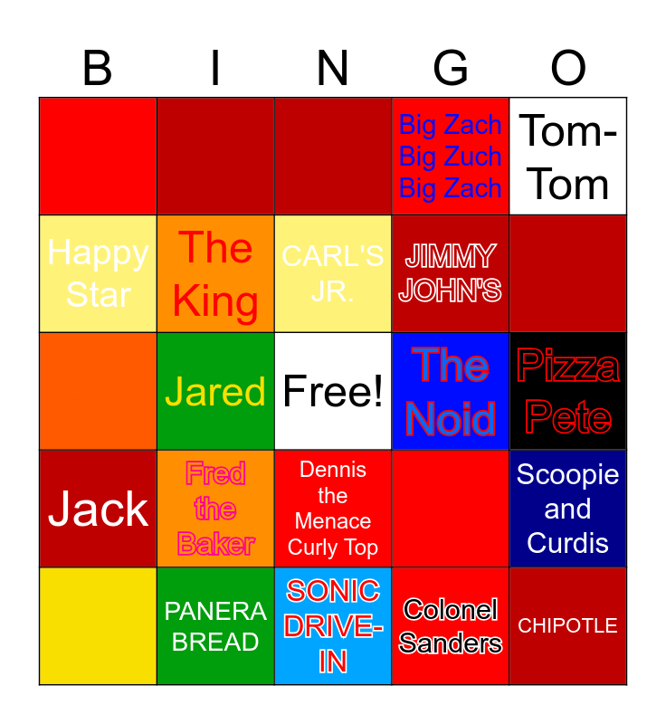 This bingo card has a free space and 29 words: Ronald McDonald, Siren, Jared, Taco Bell Chinunaha, Cow, Wendy, The King, Fred the Baker, The Noid, PANERA BREAD, Pizza Pete, CHIPOTLE, SONIC DRIVE-IN, Colonel Sanders, Oven Mitt, Little Caesar, Dennis the Menace Curly Top, Jack, Tom-Tom, Popeye, Mr. Slice, Whataguy, JIMMY JOHN'S, Happy Star, Big Zach Big Zuch Big Zach, FIVE GUYS, Scoopie and Curdis, CARL'S JR. and Big Bo Cuppy.