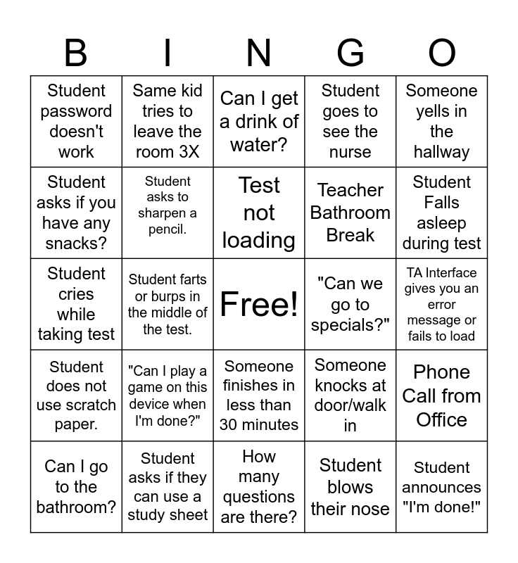 This bingo card has a free space and 29 words: Can I go to the bathroom?, Student computer is not charged., Student farts or burps in the middle of the test., Student takes off shoes while testing, Student password doesn't work, Can I get a drink of water?, Student asks to sharpen a pencil., "Can I play a game on this device when I'm done?", "Can we go to specials?", Student asks if they can use a study sheet, TA Interface gives you an error message or fails to load, Student announces "I'm done!", How many questions are there?, Student blows their nose, Student Falls asleep during test, Student taps/makes noises after test., Someone finishes in less than 30 minutes, Student does not use scratch paper., Someone yells in the hallway, Student cries while taking test, Someone knocks at door/walk in, Student forgot a silent reading book., Teacher Bathroom Break, Student asks if you have any snacks?, Student goes to see the nurse, Same kid tries to leave the room 3X, Phone Call from Office, Test not loading and Someone at your classroom door.