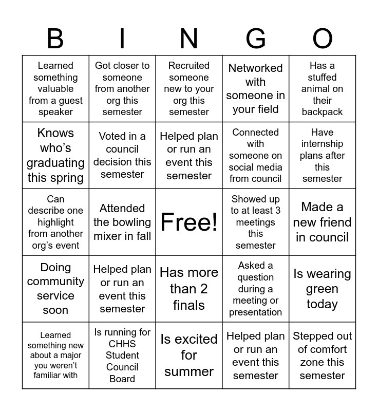 This bingo card has a free space and 24 words: Learned something new about a major you weren’t familiar with, Helped plan or run an event this semester, Helped plan or run an event this semester, Helped plan or run an event this semester, Has a stuffed animal on their backpack, Learned something valuable from a guest speaker, Got closer to someone from another org this semester, Recruited someone new to your org this semester, Showed up to at least 3 meetings this semester, Made a new friend in council, Can describe one highlight from another org’s event, Voted in a council decision this semester, Asked a question during a meeting or presentation, Is wearing green today, Knows who’s graduating this spring, Is running for CHHS Student Council Board, Is excited for summer, Networked with someone in your field, Have internship plans after this semester, Doing community service soon, Attended the bowling mixer in fall, Has more than 2 finals, Connected with someone on social media from council and Stepped out of comfort zone this semester.