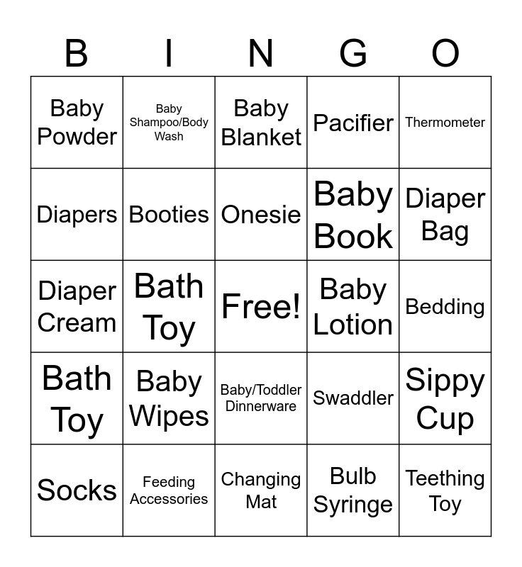 This bingo card has a free space and 29 words: Socks, Toy, Bath Toy, Wrap or Carrier, Baby Powder, Baby Blanket, Booties, Baby Wipes, Baby Lotion, Feeding Accessories, Bedding, Teething Toy, Changing Mat, Bulb Syringe, Diaper Bag, Bib, Baby/Toddler Dinnerware, Bath Toy, Thermometer, Diaper Cream, Swaddler, Bottle, Baby Book, Diapers, Pacifier, Baby Shampoo/Body Wash, Sippy Cup, Onesie and Hooded Towel.