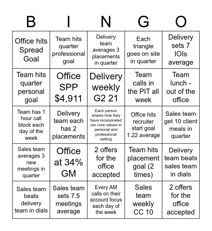 This bingo card has 26 words: 2 offers for the office accepted, Sales team weekly CC 10, Delivery weekly G2 21, Sales team sets 7.5 meetings average, Delivery sets 7 IOIs average, Office hits Spread Goal, Team hits quarter personal goal, Team hits quarter professional goal, Sales team get 10 client meals in quarter, Team hits placement goal (2 times), Team calls in the PIT all week, Team has 1 hour call block each day of the week, Delivery team beats sales team in dials, Sales team beats delivery team in dials, Delivery team each has 2 placements, Sales team each sets 3 new meetings, Each triangle goes on site in quarter, Sales team averages 3 new meetings in quarter, Delivery team averages 3 placements in quarter, Each person shares how they have incorporated our core values in personal and professional setting, Team lunch - out of the office, Every AM calls on their account focus each day of the week, Office hits recruiter start goal 1.22 average, Office at 34% GM, Office SPP $4,911 and 2 offers for the office accepted.