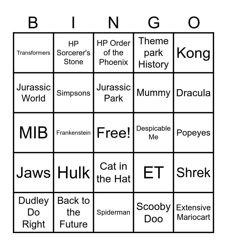 This bingo card has a free space and 25 words: Hulk, Spiderman, Jurassic Park, Dudley Do Right, Kong, Transformers, Jurassic World, HP Sorcerer's Stone, Despicable Me, Cat in the Hat, Mummy, MIB, ET, Shrek, Simpsons, HTTYD, Popeyes, HP Order of the Phoenix, Dracula, Frankenstein, Extensive Mariocart, Back to the Future, Jaws, Theme park History and Scooby Doo.