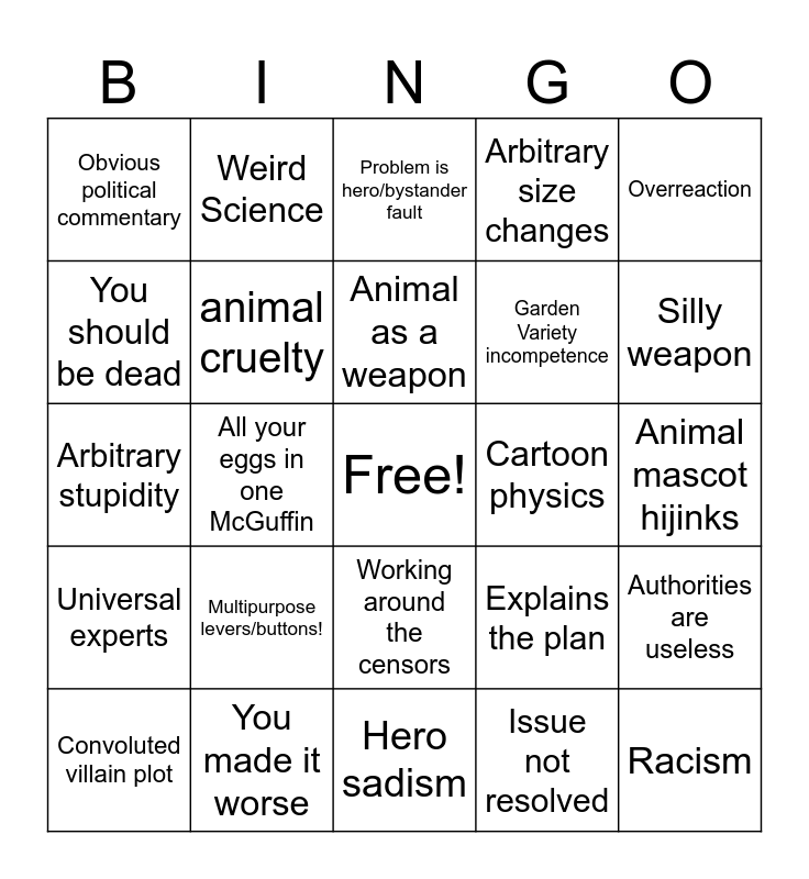 This bingo card has a free space and 45 words: Misogyny, Racism, How did you know that?, Convoluted villain plot, Plan hinges on McGuffin, Issue not resolved, Problem is hero/bystander fault, Problem is just an animal, Overreaction, You made it worse, Arbitrary size changes, Cartoon physics, Working around the censors, Multipurpose levers/buttons!, Learning a lesson, Hero sadism, Curbstomp battle, Arbitrary stupidity, Chewing the scenery, Silly weapon, Weird Science, How did you understand that?, Triumphant laughter, Obvious political commentary, Ancient secrets, Animal mascot hijinks, Hidden villain/sudden betrayal, Evil face, Explains the plan, Universal experts, Reset button, Authorities are useless, Meaningless destruction, Damsel in distress, Hokey speech/dialogue, All your eggs in one McGuffin, racism, Hokey phrase, What are you armed with?, Animal as a weapon, You should be dead, Garden Variety incompetence, Impressive incompetence, animal cruelty and BUT WHY!?!.