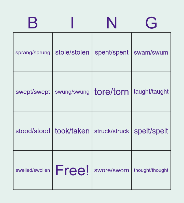 This bingo card has 16 words: Free!, spelt/spelt, spent/spent, sprang/sprung, stood/stood, stole/stolen, struck/struck, swore/sworn, swept/swept, swung/swung, swelled/swollen, swam/swum, took/taken, taught/taught, tore/torn and thought/thought.