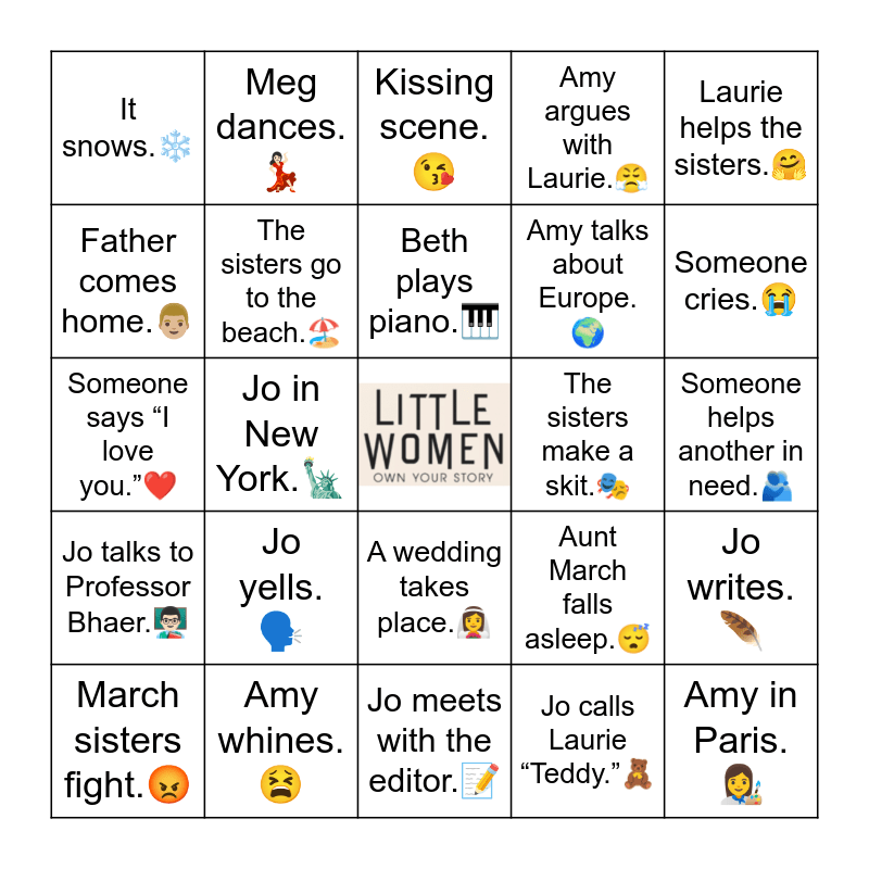 This bingo card has a free space and 24 words: Jo yells.π£οΈ, Amy whines.π«, Beth plays piano.πΉ, March sisters fight.π‘, Laurie helps the sisters.π€, It snows.βοΈ, Father comes home.π¨πΌ, Meg dances.ππ», The sisters make a skit.π, A wedding takes place.π°ββοΈ, Amy talks about Europe.π, Someone saysΒ βI love you.ββ€οΈ, Aunt March falls asleep.π΄, Jo writes.πͺΆ, The sisters go to the beach.ποΈ, Jo calls Laurie βTeddy.βπ§Έ, Someone helps another in need.π«, Kissing scene.π, Someone cries.π, Jo in New York.π½, Amy in Paris.π©βπ¨, Jo talks to Professor Bhaer.π¨π»βπ«, Amy argues with Laurie.π€ and Jo meets with the editor.π.