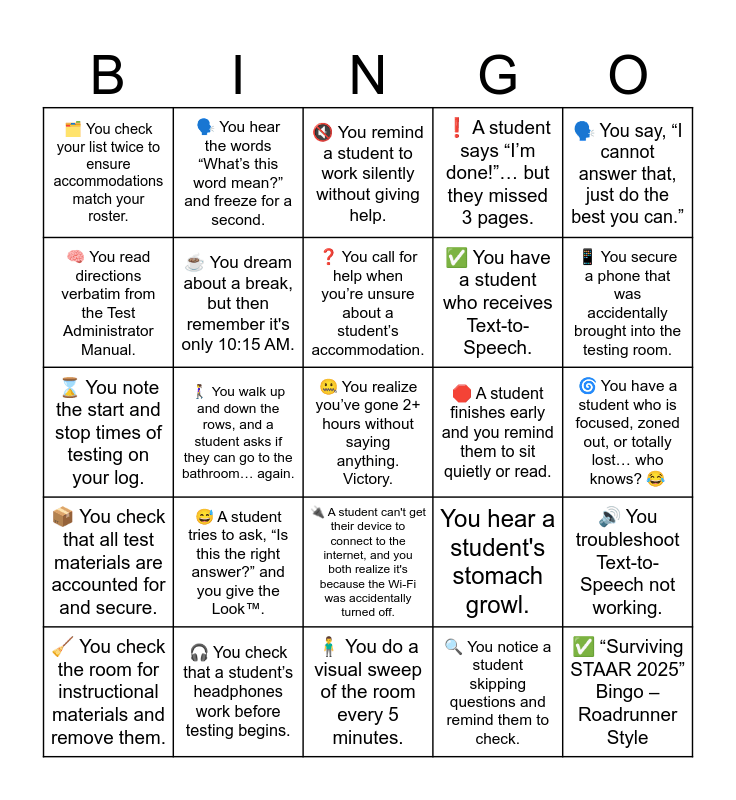 This bingo card has 27 words: You hear a student's stomach growl., ✅ “Surviving STAAR 2025” Bingo – Roadrunner Style, ✅ You have a student who receives Text-to-Speech., 🧍♂️ You do a visual sweep of the room every 5 minutes., 🧠 You read directions verbatim from the Test Administrator Manual., 🔇 You remind a student to work silently without giving help., 🗣️ You hear the words “What’s this word mean?” and freeze for a second., 📦 You check that all test materials are accounted for and secure., 🛑 A student finishes early and you remind them to sit quietly or read., 🔊 You troubleshoot Text-to-Speech not working., ⌛ You note the start and stop times of testing on your log., ❗ A student says “I’m done!”… but they missed 3 pages., 🧹 You check the room for instructional materials and remove them., 🎧 You check that a student’s headphones work before testing begins., 📱 You secure a phone that was accidentally brought into the testing room., 📖 You resist the urge to read a book during testing., ☕ You dream about a break, but then remember it's only 10:15 AM., ❓ You call for help when you’re unsure about a student’s accommodation., 😅 A student tries to ask, “Is this the right answer?” and you give the Look™., 🗂️ You check your list twice to ensure accommodations match your roster., 🌀 You have a student who is focused, zoned out, or totally lost… who knows? 😂, 🔍 You notice a student skipping questions and remind them to check., 🚶♀️ You walk up and down the rows, and a student asks if they can go to the bathroom… again., 🤐 You realize you’ve gone 2+ hours without saying anything. Victory., 🔌 A student can't get their device to connect to the internet, and you both realize it's because the Wi-Fi was accidentally turned off., 🗣️ You say, “I cannot answer that, just do the best you can.” and 🪑 You walk past the same student’s desk 12 times, and they don’t even notice you..